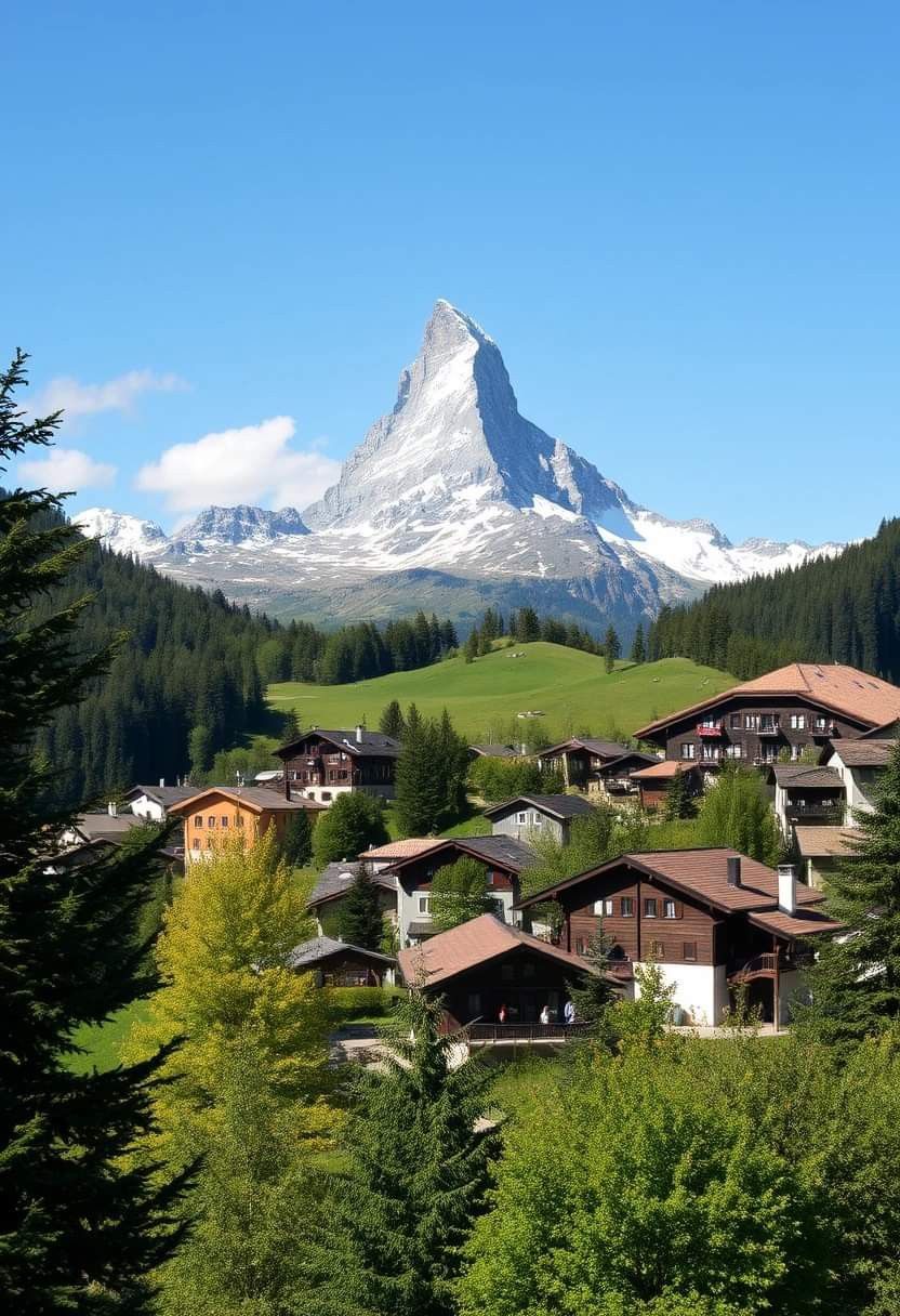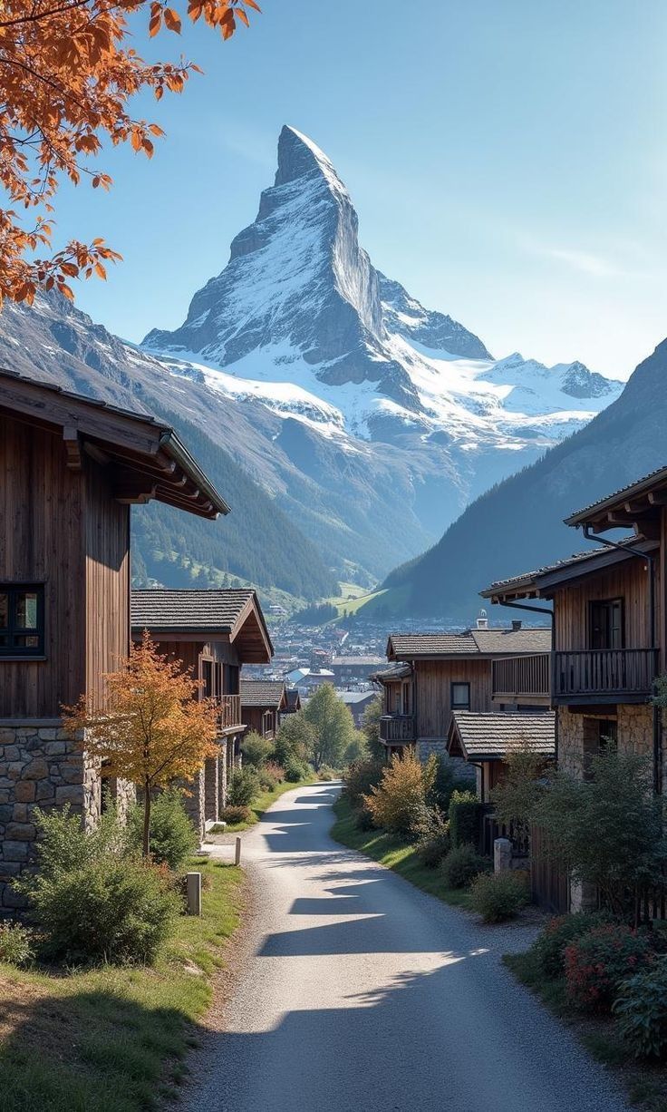 “체르마트 마을에서 바라본 마테호른, 평화로운 마을과 웅장한 봉우리의 대비.”