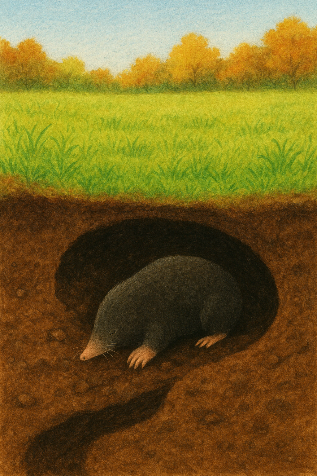 | 📖 작은 자연 백과 두더지는 지하 1미터 깊이의 터널을 파며 살아가는 포유류입니다. 땅속 곤충과 뿌리를 먹고, 지면 아래의 생태를 조용히 순환시킵니다. |